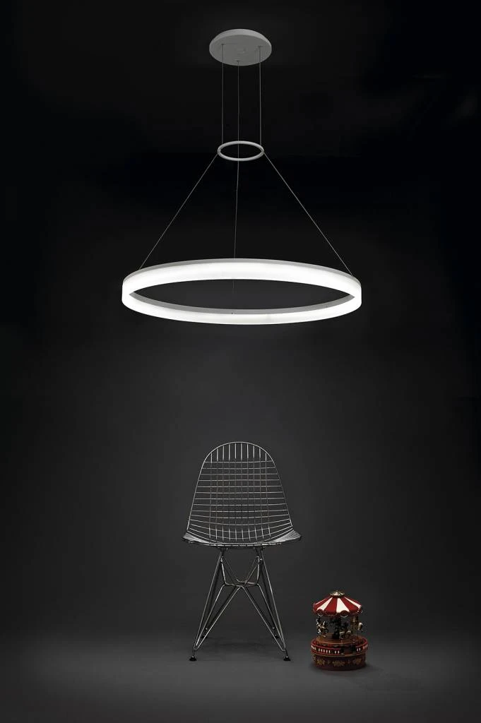 De Circ led hanglamp is mat wit wordt subtiel aan staalkabels afgehangen, de ledverlichting zit in de onderzijde van de Ø1000mm ring afgeschermd met opaal voor een egale licht verdeling.