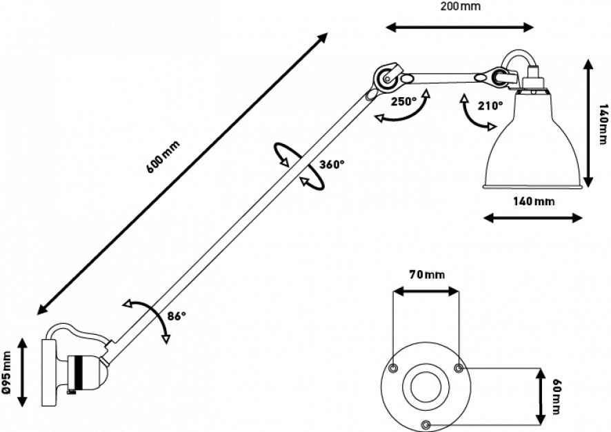 De Lampe Gras N304 L60 wandlamp van DCW éditions heeft een ronde kap met een diameter van 14 centimeter en een hoogte van 17,5 centimeter. Het stalen armatuur is zwart met een satijnen finish en voor de kappen kan gekozen worden uit de volgende 5 kleuren: zwart, rood, geel, koper en zwart buiten/koper binnen. De lamp wordt geleverd exclusief lichtbron, de fitting is een kleine (E14) fitting. De lange arm van de lamp is 60 centimeter lang, de korte 20 centimeter. De wand- of plafondbevestiging heeft een diameter van 9,5 centimeter. Deze lamp weegt 2 kilo.