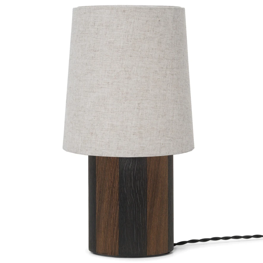 De Post Eclipse Medium tafellamp lines van Ferm Living bestaat uit een houten armatuur en een lampenkap. Het houten armatuur heeft een diameter van 18 centimeter en een hoogte van 21 centimeter. Het armatuur is gemaakt van FSC™-gecertificeerd gerookt eikenfineer met MDF-kern en is voorzien van een zwart stoffensnoer met een lengte van 2,6 meter en een aan/uit-schakelaar. De lamp heeft een grote E27 fitting en is geschikt voor een lichtbron met een maximaal wattage van 15W. De lampenkap heeft een diameter van 27,5 centimeter en een hoogte van 28,5 centimeter. De lampenkap is gemaakt van 90% linnen en 10% polyester. De tafellamp is in verschillende kleuren te verkrijgen.