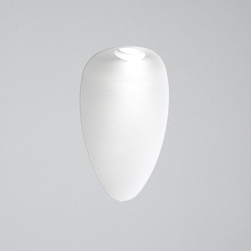 Flame is een fraai uit gips vervaardigd wand inbouwarmatuur welke na instuccen in de wand een ovale trimless opening achterlaat van Ø175mm hoog .