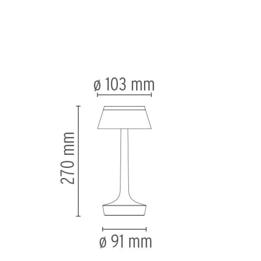 De Bon Jour Unplugged tafellamp LED koper van Flos heeft een hoogte van 27 centimeter, een diameter van 13,1 centimeter en de voet van de lamp heeft een diameter van 9,1 centimeter. De basis van de lamp is gemaakt van verkoperd ABS. Je kunt de lamp personaliseren door een van de verschillende crowns. De snoerloze lamp kan tot zes uur branden, daarna kan je hem opladen met de bijgeleverde USB oplaadkabel. Bon Jour wordt geleverd inclusief Edge Lighting LED lichtbron.