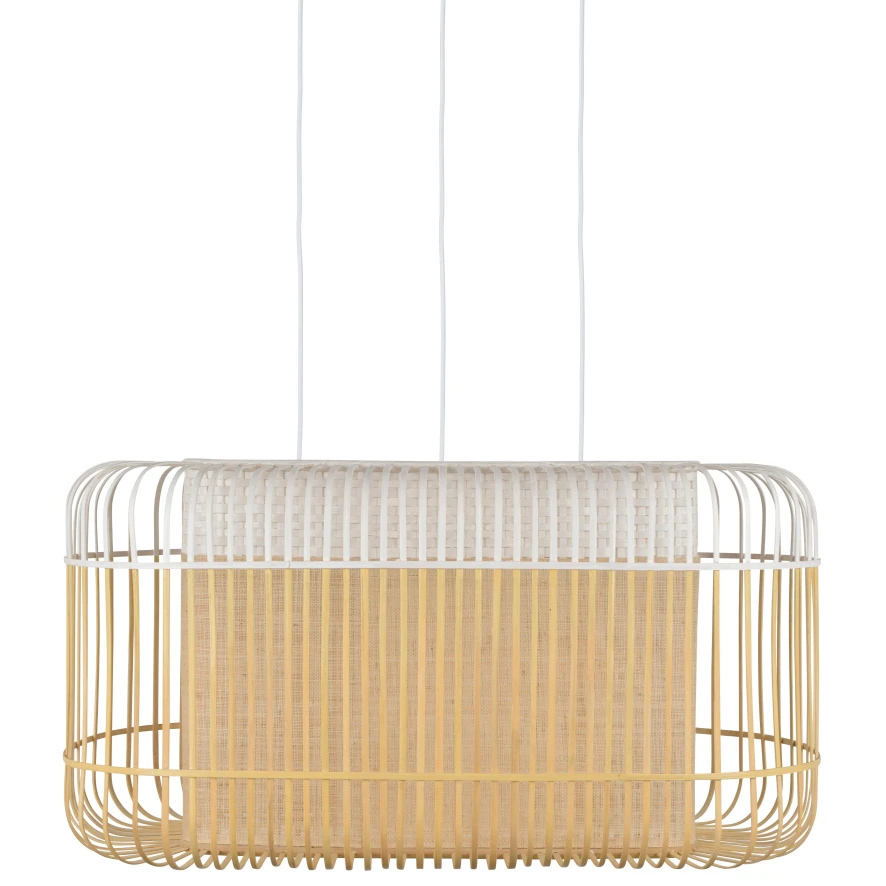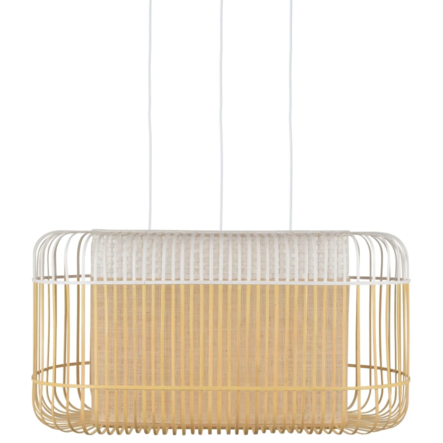 Deze hanglamp is gemaakt van bamboe en textiel. De lamp is 40 centimeter hoog, 78 centimeter breed en heeft een lengte van 45 centimeter. In de lamp zitten drie E27 fittingen, alle drie geschikt voor een LED lichtbron met een maximaal wattage van 15. Deze lichtbron wordt niet meegeleverd. Van de Bamboo Oval hanglampen zijn nog meer varianten beschikbaar: de Bamboo Oval S, de Bamboo Oval M en de Bamboo Oval L.