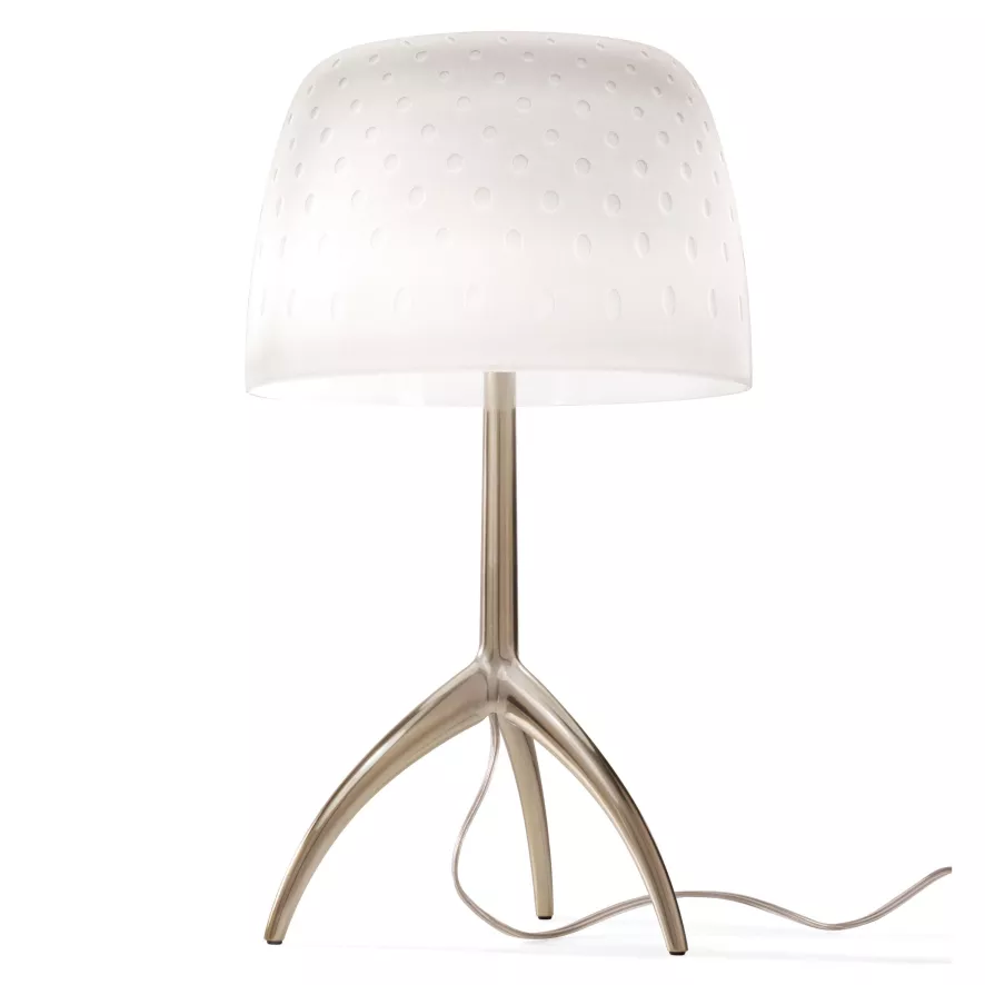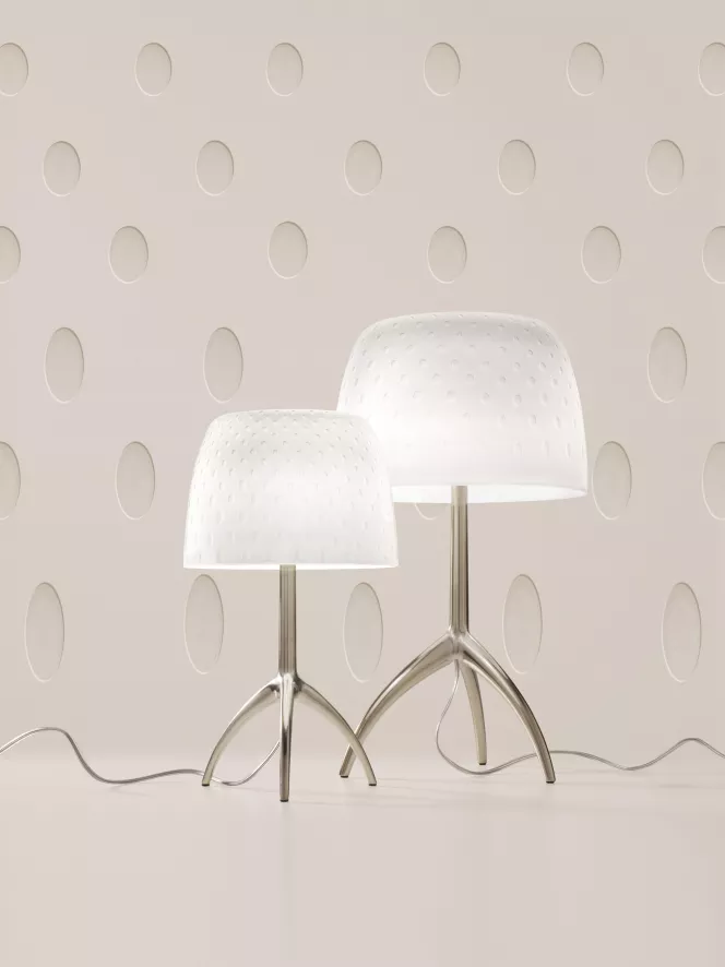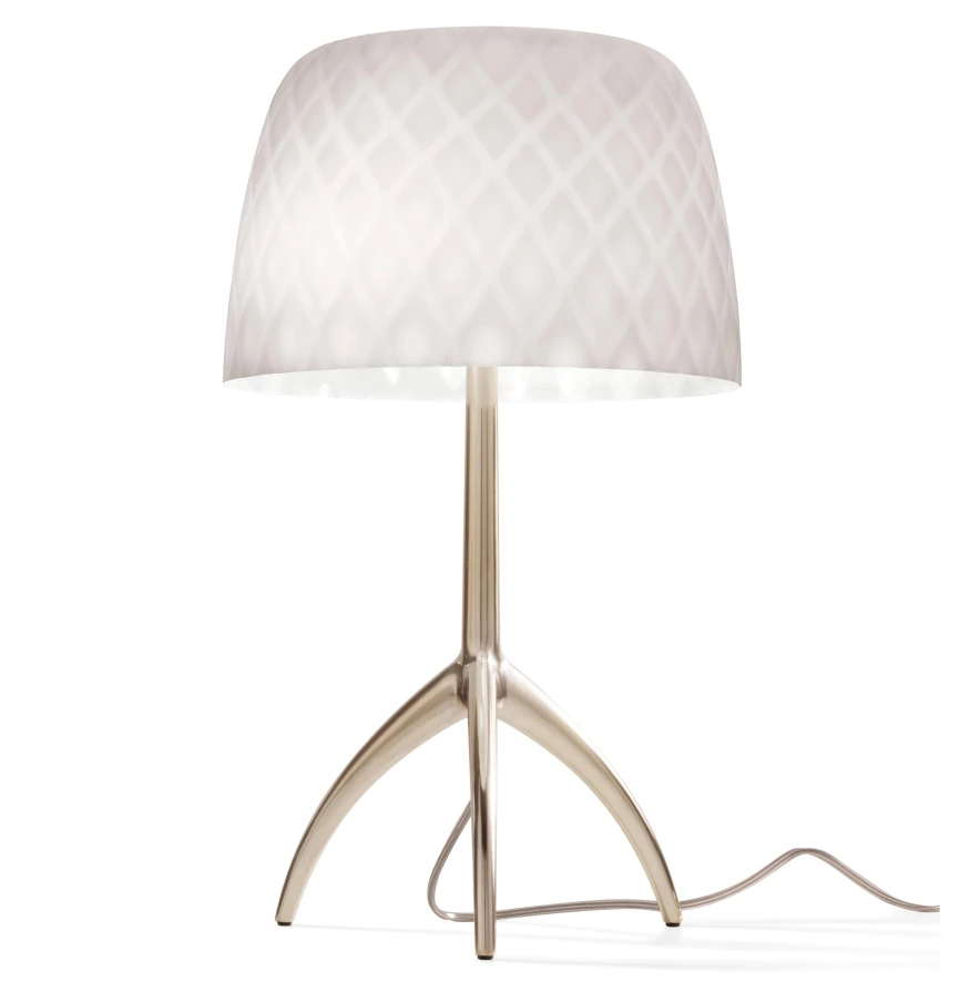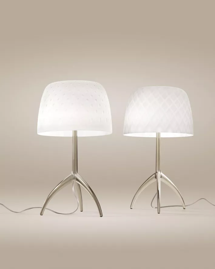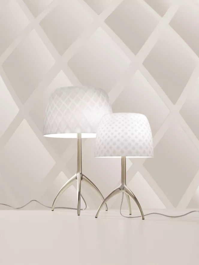 De Lumiere 30th Piccola tafellamp heeft een diameter van 20 centimeter (zowel kap als voet). De hoogte van de kap is 14 centimeter en de totale hoogte is 35 centimeter. De lamp is gemaakt van geblazen glas en geverfd en geborsteld aluminium. De lamp heeft een E14 fitting, de LED lichtbron van 6,5 Watt wordt meegeleverd. De lampenkap heeft een champagnekleur en is verkrijgbaar in twee varianten: met een gelijnd patroon en met een gestippeld patroon. De lamp heeft een transparant koord, is dimbaar en er zijn verschillende varianten van deze tafellamp beschikbaar.