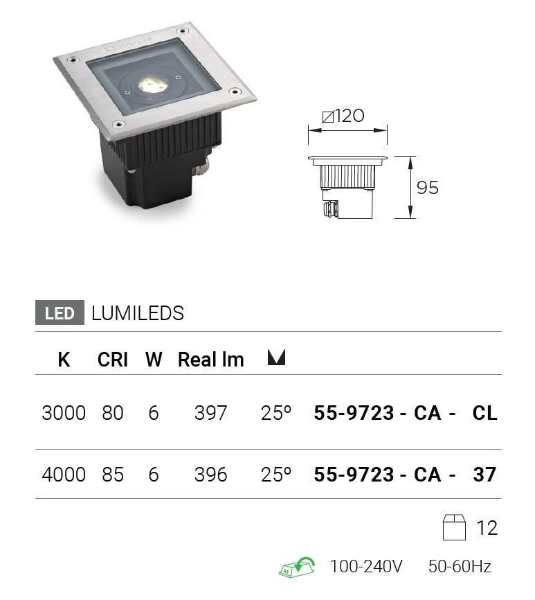 De Gea is een fraaie vierkante grondinbouwspot van 120x120mm, perfect voor het aanlichten van struiken of bomen