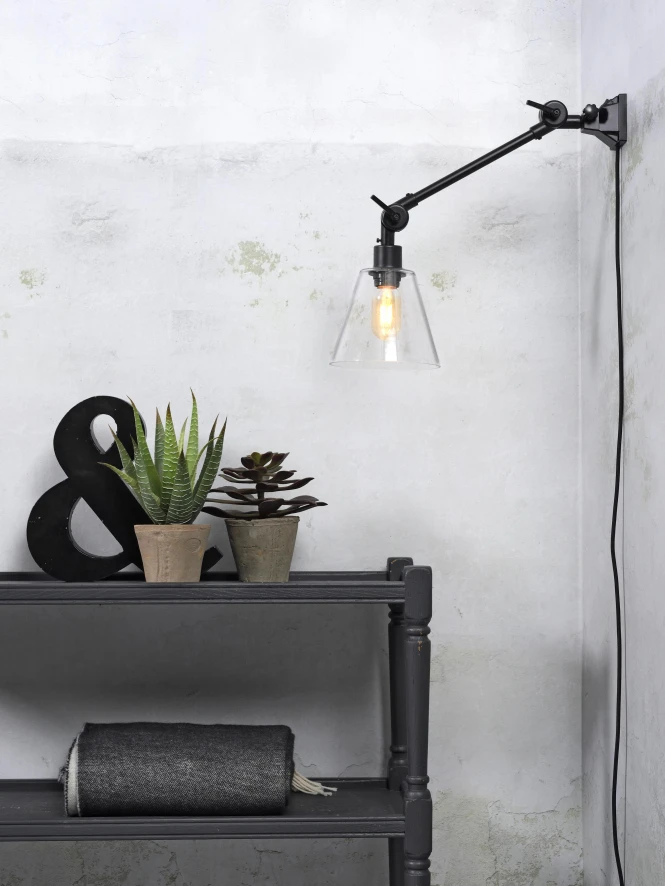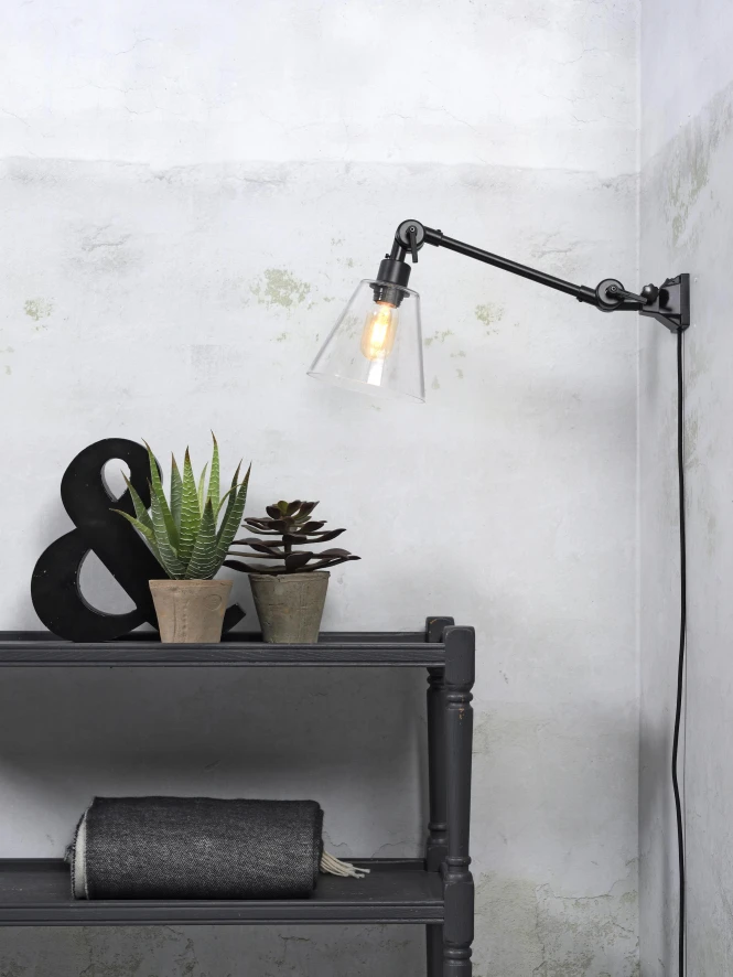 Deze wandlamp is gemaakt van ijzer en glas. In de lamp zit een E27 fitting, geschikt voor een lichtbron (halogeen od LED) met een maximaal wattage van 40. Deze lichtbron wordt niet meegeleverd. De lamp heeft een lengte van 55 centimeter, een breedte van 16.5 centimeter en een hoogte van 30 centimeter. Het snoer aan de lamp is 200 centimeter lang. Van deze wandlamp is ook een variant met een langere arm beschikbaar.