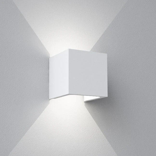 Fraaie strakke kubus vormige led wandlamp van 10 x 10 x10cm. Schijnt het licht gelijk naar boven en beneden, is vervaardigd uit naturel gips en overschilderbaar in de kleur van uw interieur.