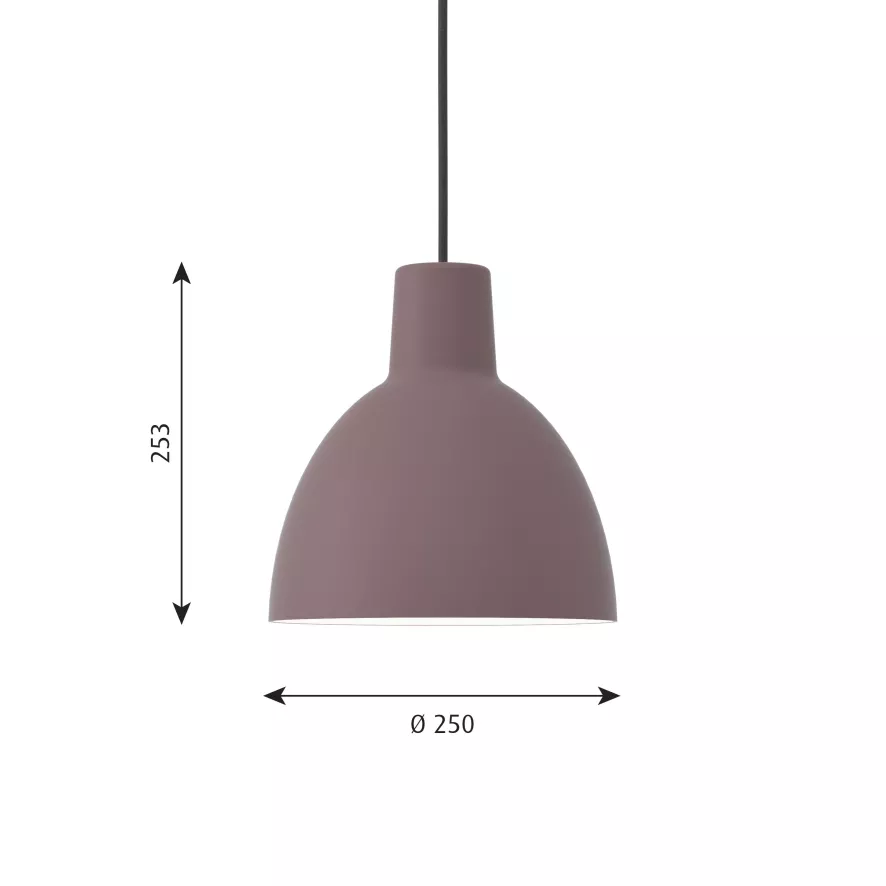 Dit is de Toldbod 250 hanglamp van Louis Poulsen. De hanglamp heeft een doorsnede van 25 centimeter. Het snoer is 260 centimeter lang en de lamp weegt 1.15 kilogram. De buitenkant van de lampenkap is gemaakt van gesponnen aluminium (mat gecoat) en de binnenkant van de kap is van gesponnen geanodiseerd aluminium. De lichtbron wordt niet meegeleverd. De lamp heeft een E27 fitting.