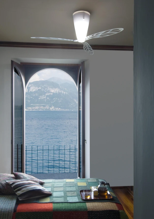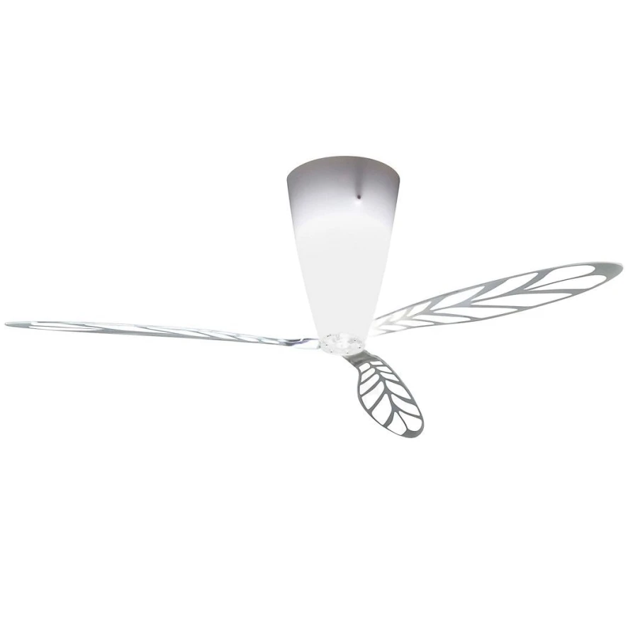 De Luceplan Blow plafondlamp heeft transparante bladen van methacrylaat die bevestigd zijn op de kap met hetzelfde materiaal. De motor op de kogellager is van aluminium. Zowel het licht als de ventilator kunnen bediend worden door een infrarood afstandsbediening. De stille motor produceert slechts 32 DB. De lichtbron wordt niet meegeleverd.
