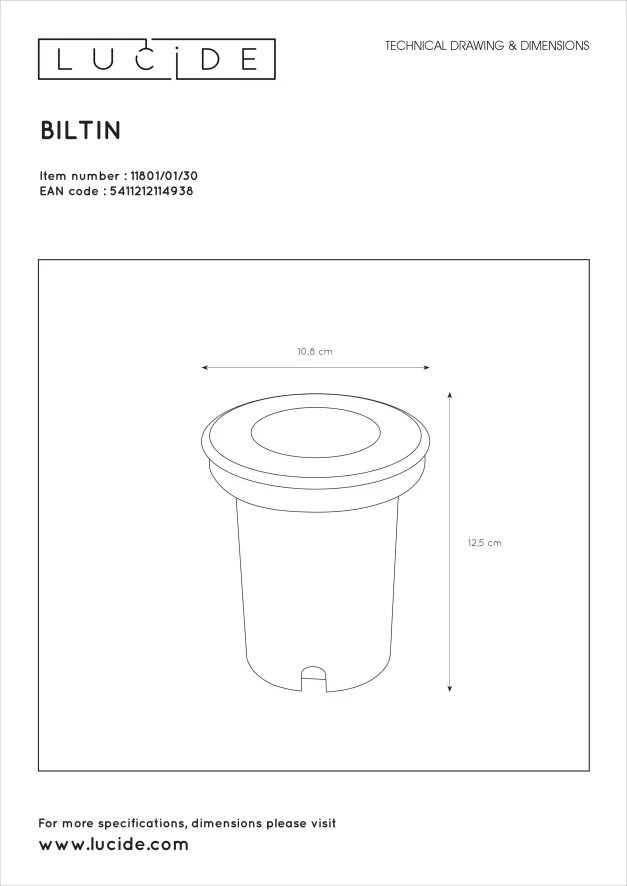 De Biltin grondspot rond IP67 heeft een diameter van 10,8 centimeter en een hoogte van 0,3 centimeter. De inbouwdiameter van Biltin is 10,4 centimeter, en de inbouwdiepte is 12,5 centimeter. De spot weegt 0,75 kilogram. Biltin is gemaakt van hoogwaardig aluminium. De grondspot wordt zonder lichtbron geleverd, de aanbevolen lichtbron is een LED lichtbron met een GU10 fitting en een maximaal wattage van 35. De lichtbron is dimbaar door aansluiting op een niet bijgeleverde dimmer. De spot kan worden bediend met een lichtschakelaar.