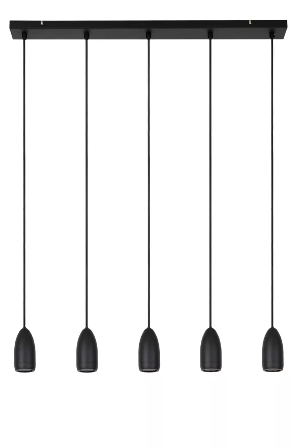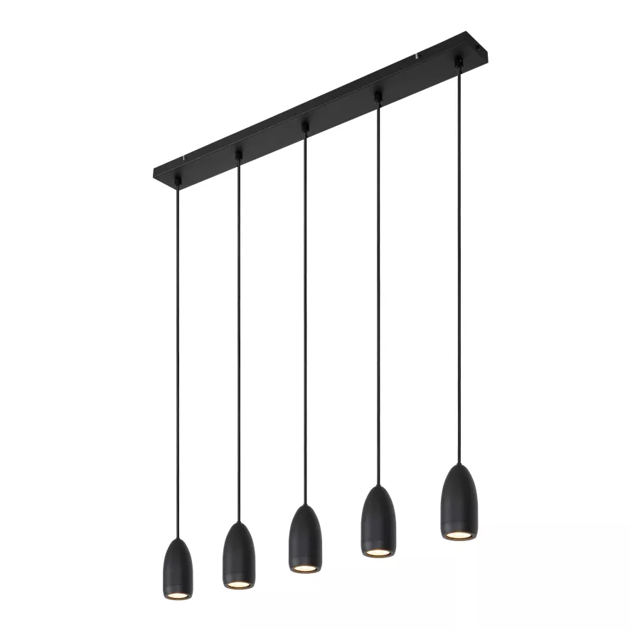 De Evora 5 cluster hanglamp lineair van Lucide heeft een breedte van 100 centimeter en een diepte van 8 centimeter. De lampenkappen hebben ieder een diameter van 6 centimeter en een hoogte van 12 centimeter. De plafondkap heeft een breedte van 100 centimeter, een diepte van 8 centimeter en een hoogte van 2,5 centimeter. De lamp is gemaakt van metaal en weegt 3,3 kilo. Voor deze lamp maak je gebruik van vijf lichtbronnen met een GU10 fitting en maximaal verbruik van 35 Watt. De lichtbronnen worden niet meegeleverd. Het is mogelijk om een dimmer (extern) aan te sluiten. De Evora hanglamp van Lucide is verkrijgbaar in diverse kleuren en opstellingen.